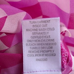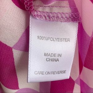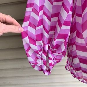 This is a lovely, lightweight blouse from NY & Company, size medium. The 100% polyester fabric is in a geometric print in white and a pinkish-purple. The popover style features three-quarter length gathered sleeves, hi-low hemline, and a self-tie bow at the neckline. This blouse is perfect with everything from a suit to jeans!