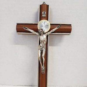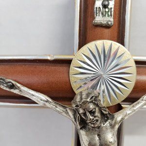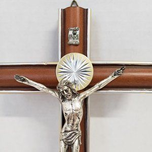 Wood Crucifix with Silver Resin Corpus and Silver and Gold accent. Beautiful Wall Cross 8"