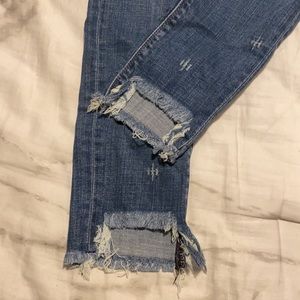 Performance stretch jeans in super cute distressed/embroidered pattern. It is technically distressed, as shown in the pictures, but almost looks like an embroidered design from a distance. No tags but never worn. Size is 4 regular