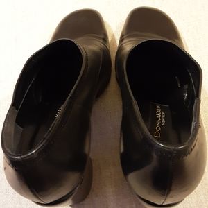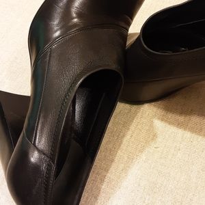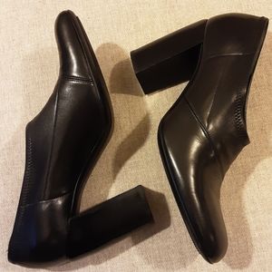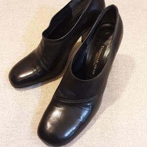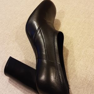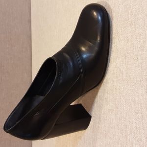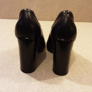 Black leather shoes 3.5" heel. The vamp throat is stretchy.