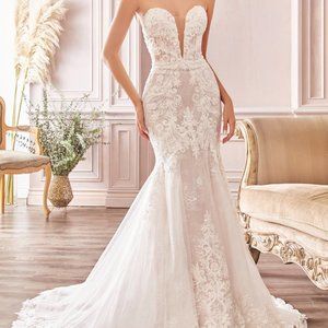 Strapless mermaid bridal gown, lace applique detail, eyelash scalloped lace train.