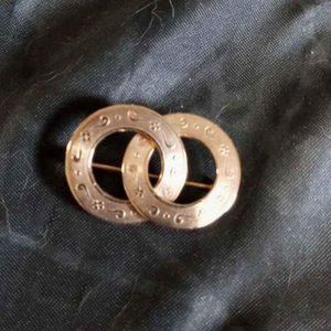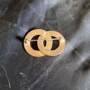 THIS VINTAGE DOUBLE INTERLOCKING GOLD TONE CIRCLES THEY HAVE A GROOVE AND SCROLL DESIGN. IT IS VERY ELEGANT AND WOULD MAKE A GREAT SCARF PIN OR BROOCH ON A JACKET OR SHIRT. THERE IS NO MAKERS MARK.. IT IS FROM THE 1960S AND IS IN VERY GOOD PRE-OWNED CONDITION... IT MAY NEED SOME CLEANING BUT OTHER THAN THAT IT IS IN GREAT SHAPE.