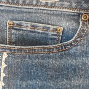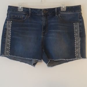 Sonoma cut off shorts with raw hem, featuring 5 pockets, and has beautiful embroidery detailing on each side, great for the summer paired with a white tee.