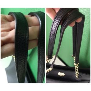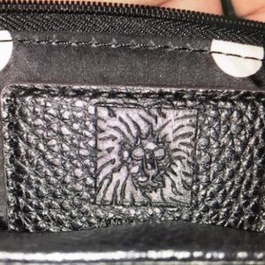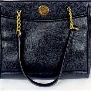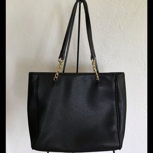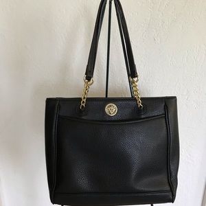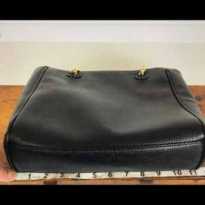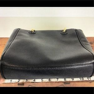 Anne Klein Black pebble bag with partial gold accent hardware chain, top zipper for closure interior lining with polka dots and very clean,interior 1 side zipper pocket,and 2 slide pockets other interior side, and outside front pocket too, shoulder bag fits nicely. Excellent condition pre-owned gently worn. No rip, tear or scratches.