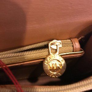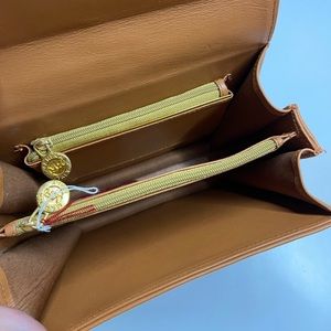 Golden toned hardware (a bit tarnished due to vintage nature of the purse), adjustable shoulder strap 4 compartments inside (2 zippered)