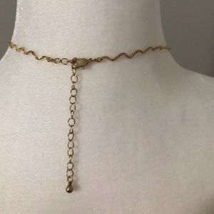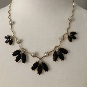 Adorable Pearl and Black necklace!! The necklace is gold tone and has a black floral design with pearls dotted in. There is linkage in the back to adjust length.