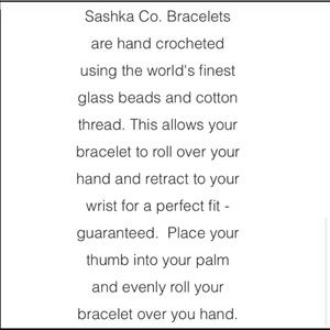 Sashka Co. Bracelets are hand crocheted using glass beads & cotton thread. This allows the bracelet to roll over your hand & retract to your wrist for a perfect fit. Every Bracelet is handcrafted by a skilled artisan in the Kathmandu Valley of Nepal. Yes, Sashka Co. Bracelets can get wet. Perfect to stack!
