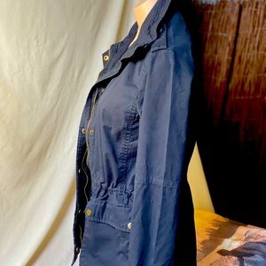 Lightweight jacket with inside waist cinch, zippers and snaps.
