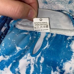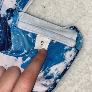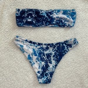 Blue and white waves / tie dye pattern Bandeau Bikini set. Removable pads and structured support on sides of bandeau (pics 3 & 4). Cheeky bottoms. Worn once. Size Small.