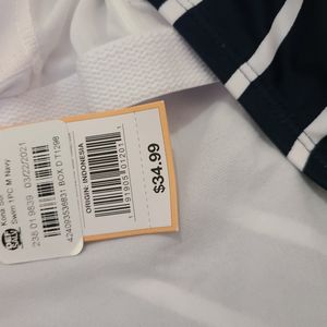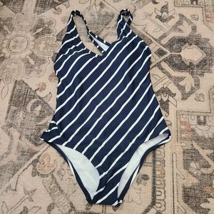 Get a classically chic beach look that's also comfortable with the Slated Stripe Medium-Coverage One-Piece Swimsuit from Kona Sol. This striped one-piece features a scoopneck with sewn-in cups for comfortable coverage, and the thick straps crisscross in the back for plenty of support without digging in or sliding around. The allover white stripe on navy design provides a flattering nautical look you'll love, but gets a little extra interest from the diagonal angle on the front and the back seam.