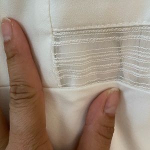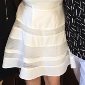 Sweet, playful, and totally charming! Ivory woven poly is silky soft and light throughout the fitted bodice with rounded neckline, princess seams, and sexy sheer mesh panels. The skater skirt completes this party-ready ensemble with more alluring bands of mesh. Circular cutout at back. Hidden side zipper with clasp. Fully Lined.