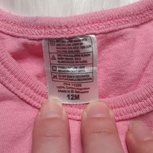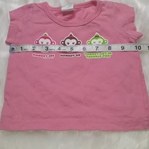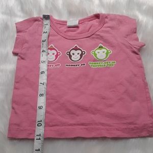 Light pink short sleeve baby girl tshirts that states "Monkey See, Monkey Do, Monkey get in trouble too". Please see pictures for measurements. Good condition from a non smoking household. Bundle with another item to receive a personal shipping discount. 100% cotton.