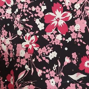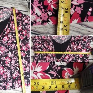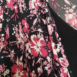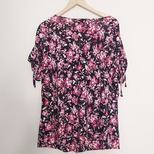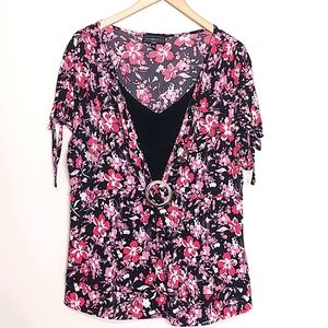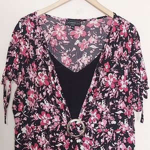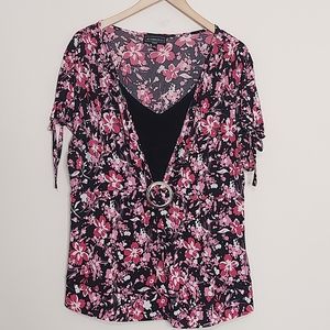 Solid black underlay a pink & black floral print blouse (all one pullover piece) with keyhole cutout on short sleeves tie/loop bow