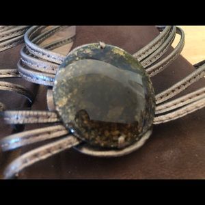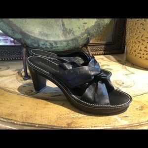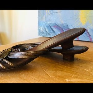 Excellent condition with little wear. Brass tone leather straps with stone. Heel is 1.5 inches. Stored in original box. Smoke free home.
