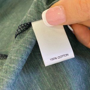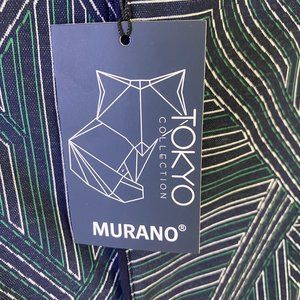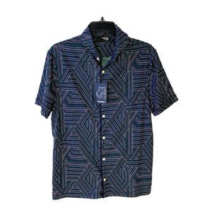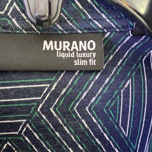 NWT Murano Liquid Luxury Short Sleeve Shirt. The fabric on this shirt lives up to its name... It feels very luxurious. The pattern on the shirt has a lot of style too. It is a navy blue base with modern geometric lines of green and white. The collar is cool because it has a slightly different cut to it & it's not pointy like so many shirts. This shirt would be great for traveling, out on the town, business lunches and a sports outing. Its stylish and has an athletic-like fabric quality.