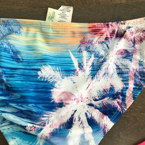 Beautiful design; hot pink tie strings on sides; colorful design with palm trees; tags attached