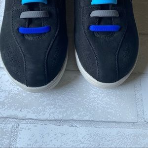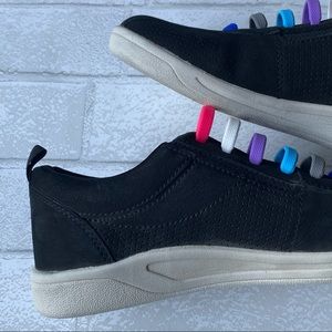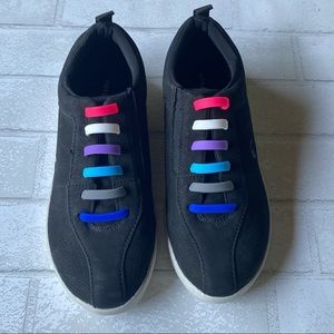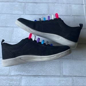 This Pair of Slip-On Sneakers by Easy Spirit are a Size 6 1/2. They are black in color with leather/textile uppers, a man made white balance and multi-colored stretchy laces that don't need to be tied. Worn once. Excellent Condition!