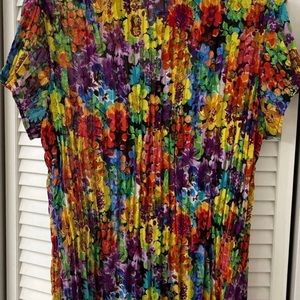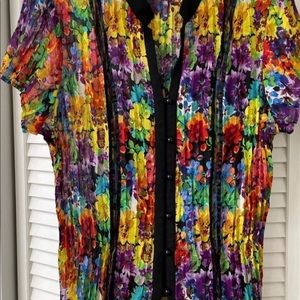 Women’s button down floral shirt. Lightweight accordion patterned material with short sleeves. Vibrant colors, black piping and ribbon lace with black buttons. Excellent condition/like new. Offers welcomed.