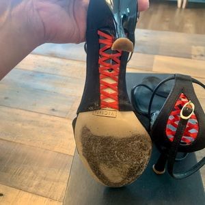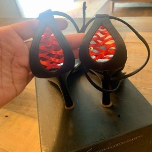 Sexy Black Giuseppe Zanotti heels with red lace up corset design in back and underneath. Size 6.5 in original box. A little lifting on the toe but can be easily glued down. Otherwise in great condition.