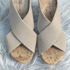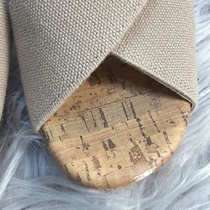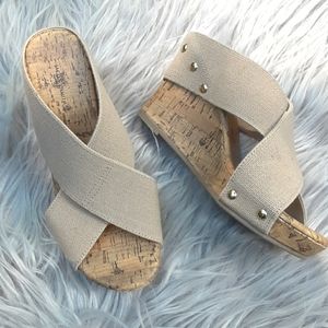 Beautiful wedge sandals from Jaclyn Smith! Wide neutral fabric straps with gold stud hardware. Cork lower. In excellent gently pre worn condition. Minor flaws shown in photos. Sz 7.