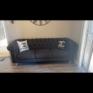 It’s a new grey couch comfy an classy, just trying to redo living room