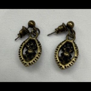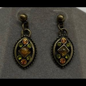 Women’s vintage style earrings in antique brass finish with multicolored stones. Delicate appearance with colored stones in orange and green. Great condition with posted backs. Offers welcomed.