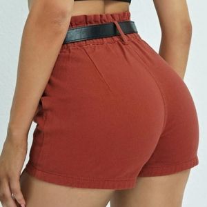 Paper-bag waist denim shorts with pockets. The belt is included. High waistline, straight leg, and zipper fly closure. Regular fit with non-stretch fabric.