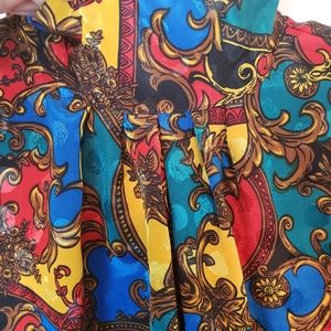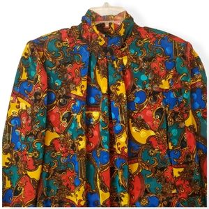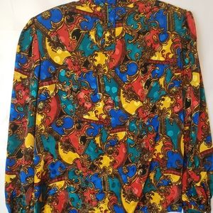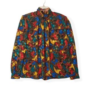 Laura & Jayne Collection Vintage bright and colorful long sleeve blouse with high neck slight pleating in front and back neck buttons. In excellent clean condition and comes from a smoke free home.