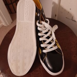 Mens black with yellow high top sneakers. White laces. Nwt
