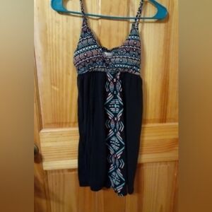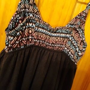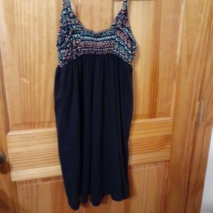 Great used condition. No rips or stains. Nonsmoking home. Beautiful spaghetti strap dress. Dark gray with a beautiful design that goes down the middle. The dress goes to about a little above the knee.