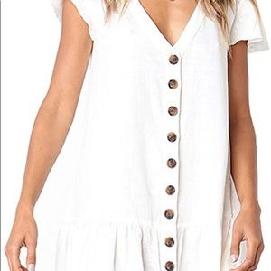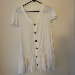 Lightweight white mini dress with buttons up the front and a drop waist. This dress is thin, I wore a slip underneath and received many compliments. Could also work great as a beach cover up!