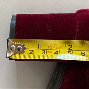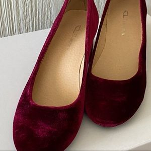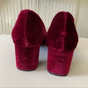 These CL by Laundry Heels are so cute! They are a deep red (described as wine). The material is velvet (velour type texture). They are vibrant! The block heel and round toe give a fun, fresh look to this style. Size 7M