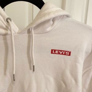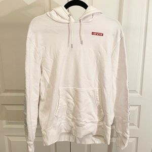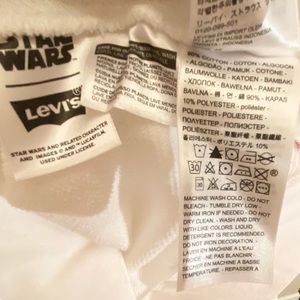 This is a preowned Star Wars X Levi’s collaboration Limited addition sweatshirt in Men’s Medium. Originally purchased for over $85 at Disney Springs. It is a white hoodie with Terry on the inside which can be worn during warm spring time or during the fall and winter. It is in good condition as it was rarely worn (no stains holes or tears). It features wording on the sleeves and Star Wars characters R2-D2 and C-3PO on the back. Don’t miss out on this! ✨✨✨