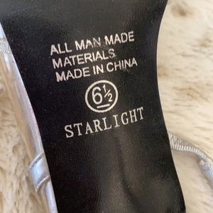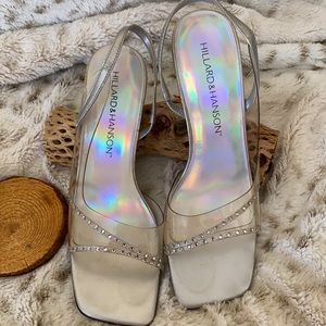 Pump with see through straps And rhinestones all around the toe area. Clear see-through plastic heel of 3 inches. Silver in color.