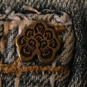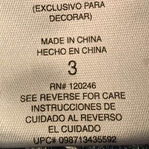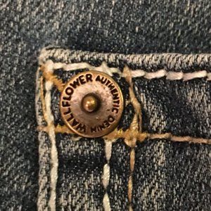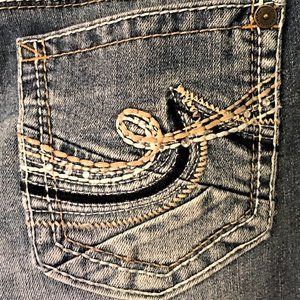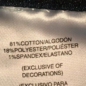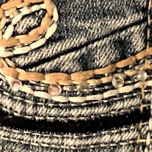Whiskered with 5-pocket styling, single button and zip close. Branded rivets and buttons. Unique tailoring and embroidered design on back pockets (a few of the tiny rhinestones are missing). Cotton blend with 1% spandex