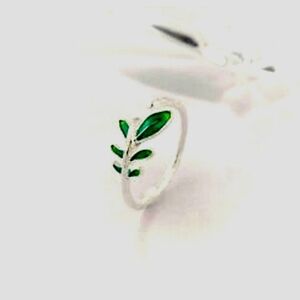 Sterling silver thin band with beautiful rich green leaves that lead to the end of a branch where there is a larger size leaf.