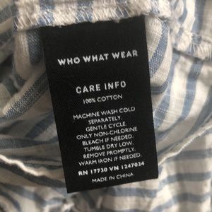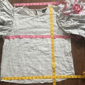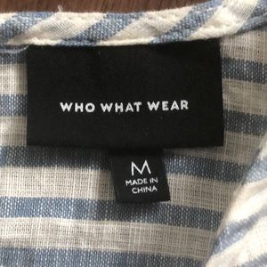Lightweight Gauzy 100% Cotton classic Blue & White stripe Who What Wear blouse. Back button closure at neck with a Keyhole opening. Tiered wide cut exaggerated Ruffled 3/4 length sleeve. Scoop neck. Relaxed boxy fit. Comfortable and stylish! In very good previously loved condition with no rips stains holes or tears. Please see pictures for approximate measurements, more detail and condition. Enlarge photos as needed. Questions encouraged.