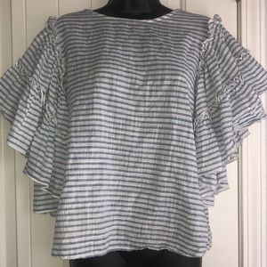 Blue White Stripe 100% Cotton Blouse Ruffle Sleeve