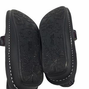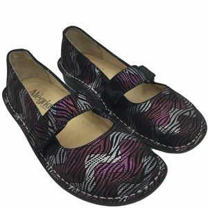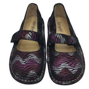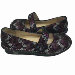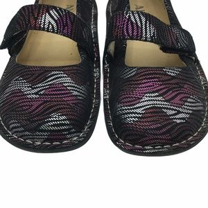 Alegria by PG Lite Paloma Mary Janes with a wave pattern in metallic pink and silver on a black background. A lightweight rocker platform perfects the all-day ease of a feminine slip-on designed with plenty of plush, memory-foam cushioning. Velcro closure. Style Fel-326