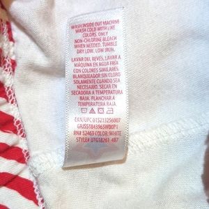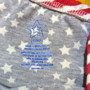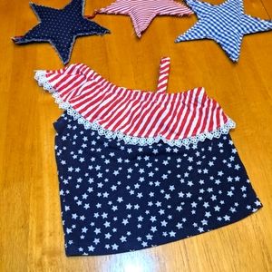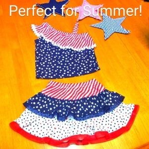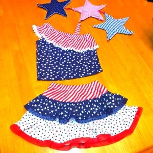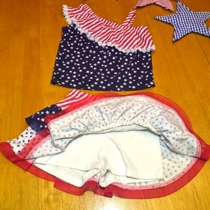 Two-piece toddler outfit with patriotic print. Ruffled skirt with built in short. Lightly worn but good condition of stains were flaws. Perfect for the summer picnics.