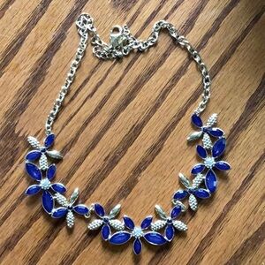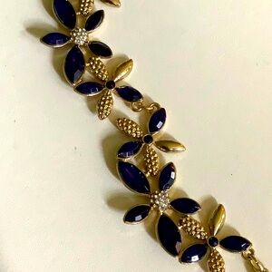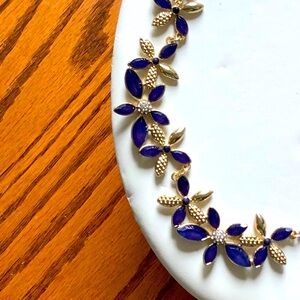 This necklace by New York & Company is stunning with navy and gold flowers. Ten total flowers in two different sizes. There is a picture of the necklace from the back. It has a designed pattern in gold. This necklace can be worn on either side. Stunning classic retro replica necklace. The length of the necklace is 18” with a 2” extender chain. Ships from a smoke free environment.