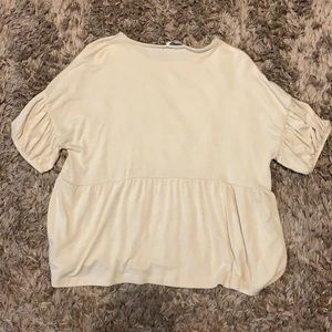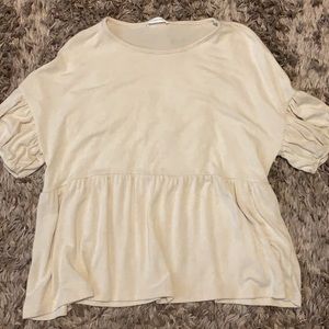 This is a shirt I bought from a boutique (dress up). It’s a off white/tan color with ruffle sleeves. It’s in great condition, had never been worn, and has no holes or stains.
