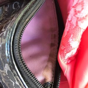 Cute Small Black Fabric Coach Wristlet measuring about 6 inches wide by 4 inches high, super cute, excellent condition on exterior, a makeup stain on upper interior lining as shown in last photo.