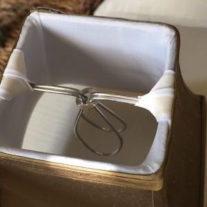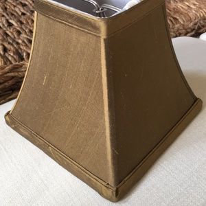 Lampshades. Set of 4. Beautiful antique gold color fabric that looks like silk. Fully lined with fabric. Sits on a small lightbulb. Approximate measurements 3” square at top, 6” square at bottom, 5 1/2” tall. New condition!