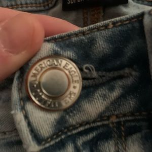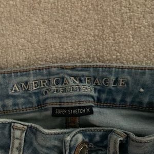 Very cute american eagle jeans!! stretchy and size 6. they have a lot of holes and they were worn a lot but still in really good condition. they is a little string poking out of the button but that’s it!!