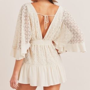 Bohemian lace crochet romper with elastic waistband and button detailing.