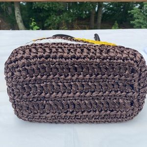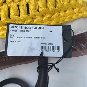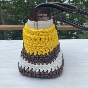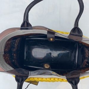 30% PVC, 10% leather. Multi yellow, brown, white, snap closure, cream leather trim, dark leather handles inside lined PVC, approx H 9” L 12” W 6”, leather trim 1” PVC showing 1 1/4”, handles 7”.