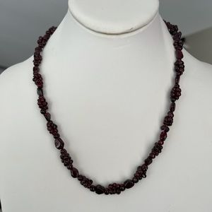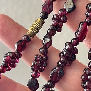 This is a gorgeous antique garnet bead bead necklace. It has hues of red and purple and looks absolutely amazing on the neck. The clasp is made of an antique bronze tone base metal and has a screw on and off mechanism. Measures 20 inches long and weighs 35.4 grams. In excellent vintage condition.