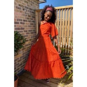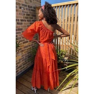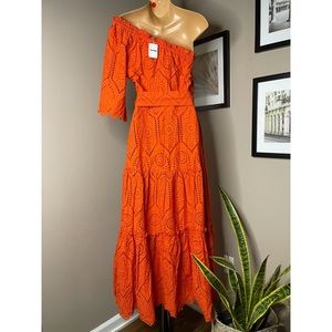 Lovely in an eyelet lace fabrication, this so special maxi dress is featured in a one-shoulder silhouette with defined bottom hemline and waist tie detail for added shape.