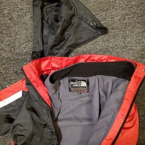 Removabke fleece liner, or waterproof lightweight shell for cooler days. Removable hood. Red black and white. Very nice piece